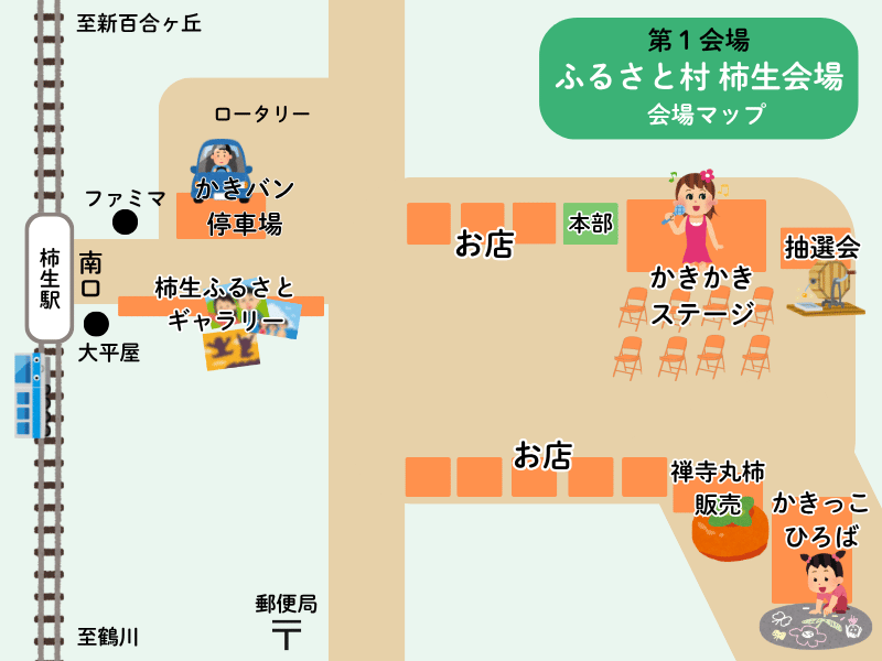 柿まつり2025・第1会場 ふるさと村・柿生会場 2025年10月8日 最終更新日時 : 2025年10月10日 minpromotion 時間 10:00~15:00 会場 第1会場:柿生駅南口 とん鈴前広場ふるさと村・柿生会場 GoogleMAP 会場間送迎サービス「かきバン」(無料) 2会場を行き来する送迎バンがあります。 第1会場 都度、行き来します 第2会場 会場マップ イベント スタンプラリー 禅寺丸柿即売会 商店賞抽選会 その場でわかる!景品なくなり次第終了。 かきっこ広場 柿生フォトギャラリー キャラクター チョリ山チョリ男 かきまるくん ステージ 9:55 オープニングセレモニー オープニングセレモニー 八重樫東(ボクシング・元世界チャンピオン)、登場! 10:10 翠々音 翠々音 10:25 影山アイン アニソンものまね 影山アイン アニソンものまね 10:40 KUU KUU 10:55 みさーもん みさーもん 11:15 東京妄想地図 うたえば、街がたのしくなる! 好きです柿生ファミリーライブ 東京妄想地図 うたえば、街がたのしくなる!好きです柿生ファミリーライブ かきまるくんも登場! 11:35 柿皮むき大会 参加型ゲーム。参加申し込みは、ステージ左の本部受付まで。 柿皮むき大会 参加型ゲーム。参加申し込みは、ステージ左の本部受付まで。 11:55 柿タワー大会 参加型ゲーム。参加申し込みは、ステージ左の本部受付まで。 柿タワー大会 参加型ゲーム。参加申し込みは、ステージ左の本部受付まで。 12:20 Happiness Dreamer Happiness Dreamer 12:35 柿生かるた 参加型ゲーム。参加申し込みは、ステージ左の本部受付まで。 柿生かるた 参加型ゲーム。参加申し込みは、ステージ左の本部受付まで。 12:55 輝楽 輝楽 13:10 KAKIO General Collection(KGC) ファッションショー KAKIO General Collection(KGC) ファッションショー 13:20 KATスクール KATスクール Satoru from AMWも登場! 13:40 Natsuki from AMW Natsuki from AMW 13:45 AMW AMW 14:00 そよそよ合唱団 そよそよ合唱団 14:30 apollo卯弦界 apollo卯弦界 14:45 盆踊り 盆踊り 14:55 第27回 禅寺丸柿まつり・2025 柿まつり2025・第2会場 未来トンネル会場